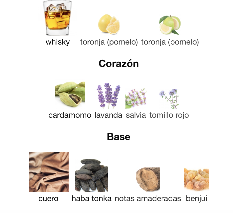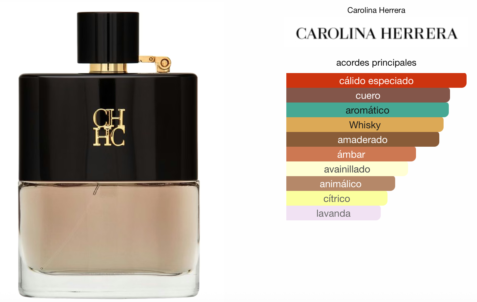 CH Men Prive de Carolina Herrera es una fragancia de la familia olfativa Cuero para Hombres. ... Las Notas de Salida son toronja (pomelo), toronja (pomelo) y whisky; las Notas de Corazón son lavanda, salvia, tomillo rojo y cardamomo; las Notas de Fondo son cuero , benjuí, haba tonka y notas amaderadas.