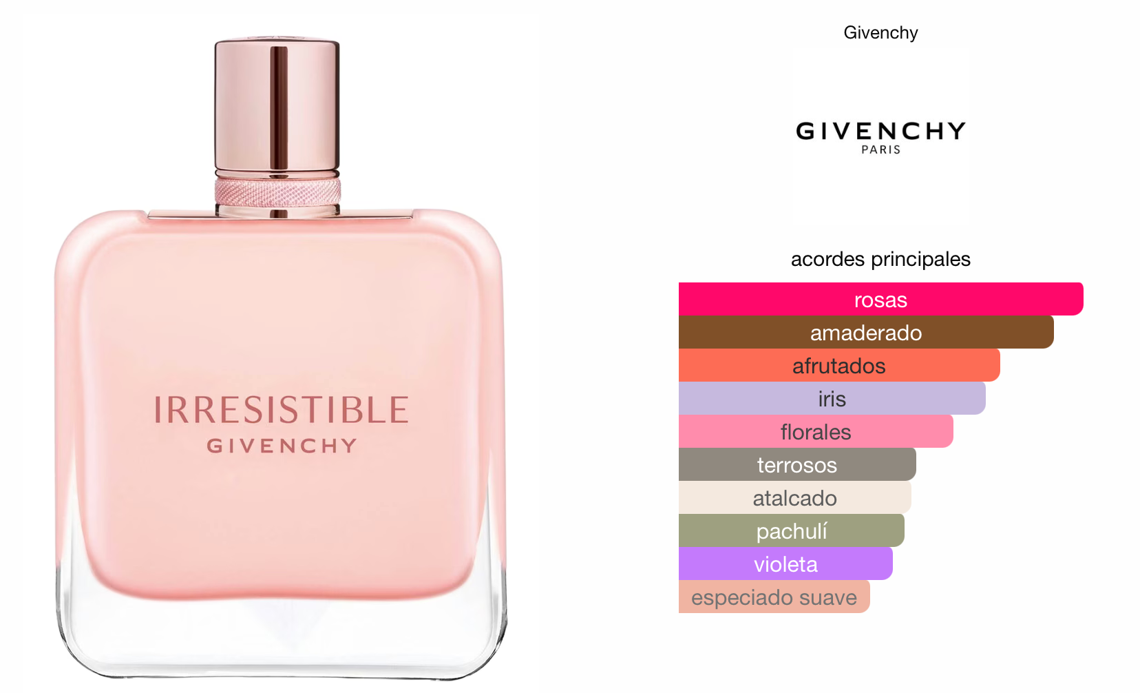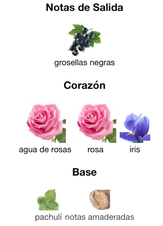 El perfume de mujer se abre con suculentas Grosellas Negras, que realzan la aterciopelada feminidad de la Rosa, la flor distintiva de Irresistible. El Lirio acaricia esta nueva faceta de la rosa con su textura empolvada, fundiéndose con el sensual Pachulí Blanco y la Delicada Madera.