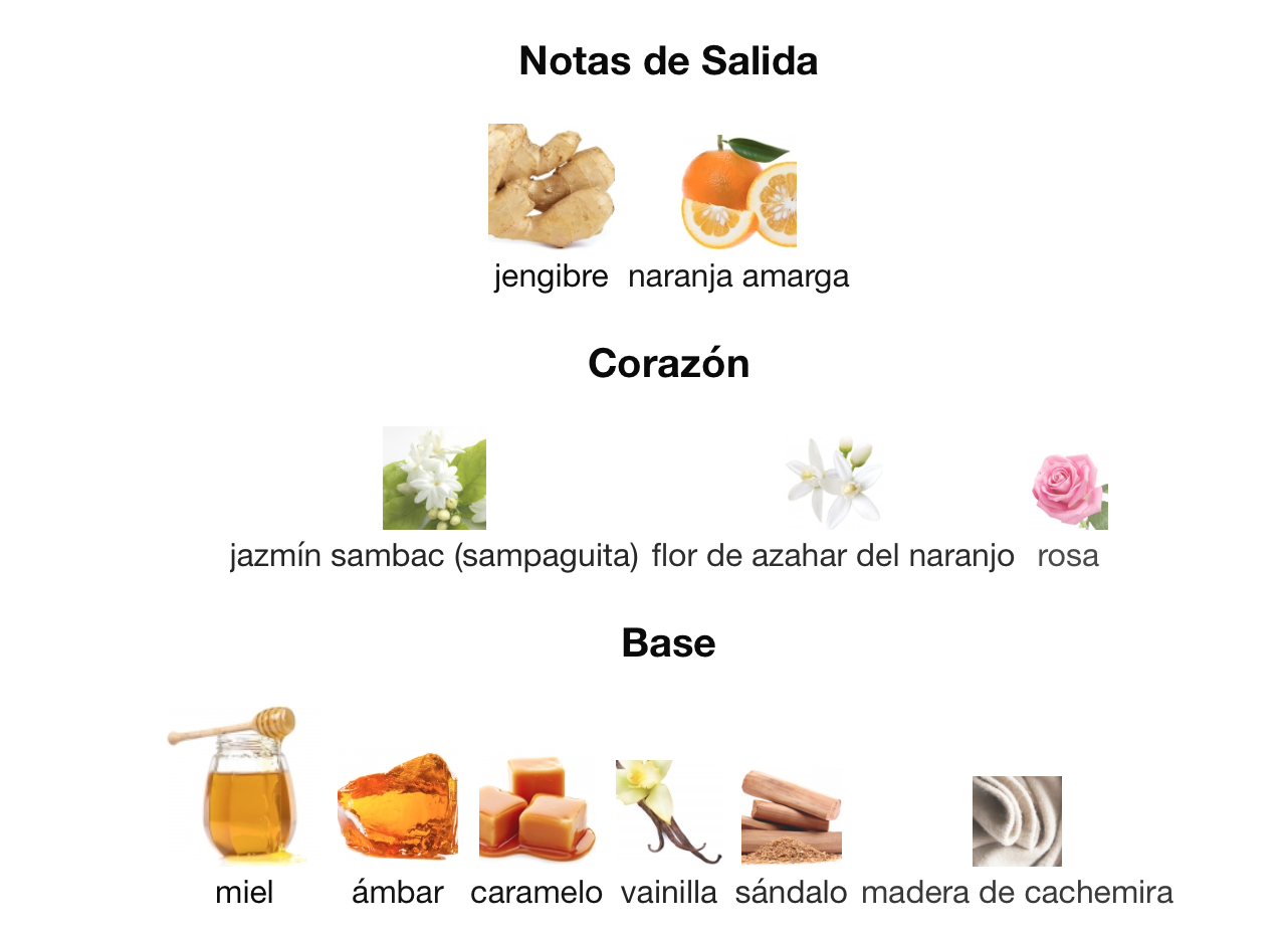 Su pirámide olfativa inicia con jengibre y naranja amarga, una sorprendente e intensa combinación, que se posa sobre la piel para abrir paso a un corazón ultra-femenino, protagonizado por jazmín sambac, flor de azahar del naranjo y la reina de las flores, la rosa.