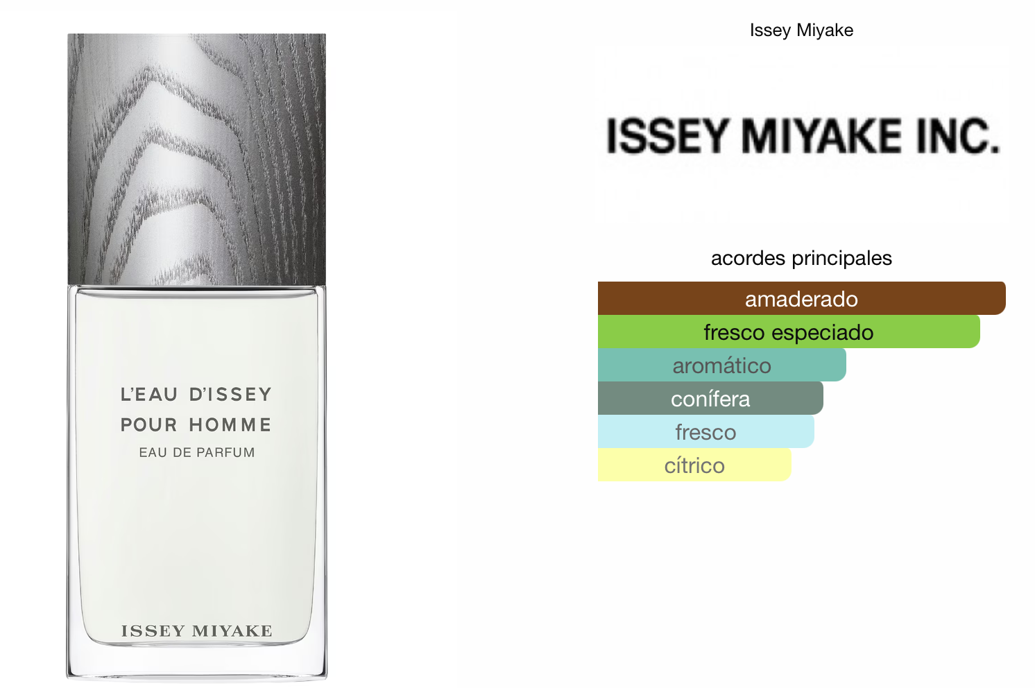 L'Eau d'Issey pour Homme es una fragancia acuática amaderada con un yuzu fresco y chispeante como nota de salida, junto con notas de limón y mandarina. En el corazón, la nota de nenúfar aporta una faceta acuática, sutilmente caldeada por notas especiadas.