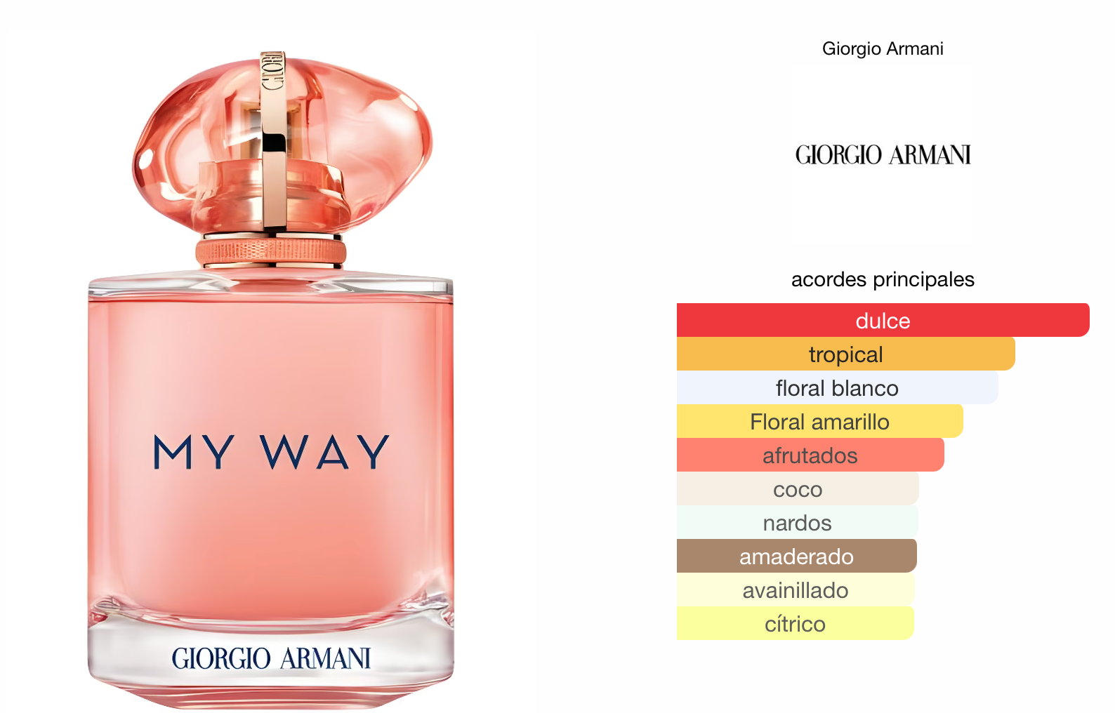 My Way Ylang Eau de Parfum es una reinterpretación luminosa y exótica de la colección My Way de Armani. Con una apertura jugosa de mango y flores blancas, este perfume evoluciona hacia un corazón solar y cremoso de Ylang-Ylang, leche de coco y nardo, aportando frescura y elegancia.